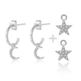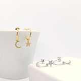 Los pendientes "Night" son tres en uno. Puedes utilizar solamente el aro o con cualquiera de las dos parejas de colgantitos. Crea tu combinación preferida y lucirás perfecta.
